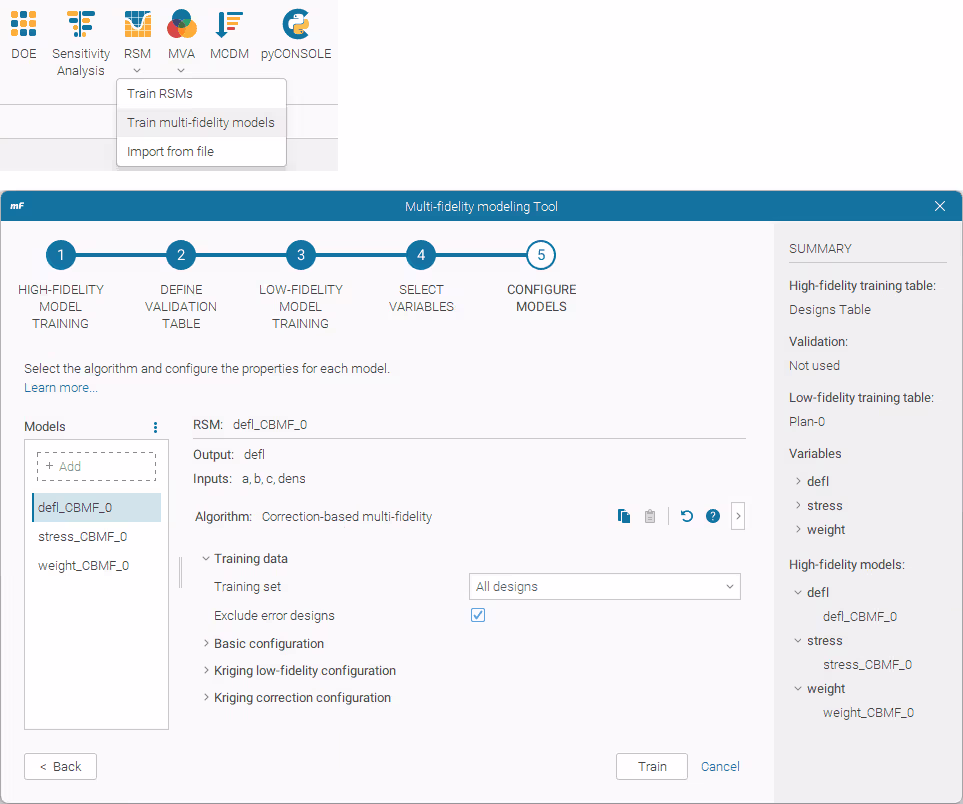 In the first case, the multi-fidelity model is trained with an existing RSM model in the Design Space and an HF table of designs. In the second case, it’s trained with both an LF and HF table of designs. Therefore, the first scenario offers a wider choice of LF models and allows users to fully configure the low-fidelity RSM training parameters.